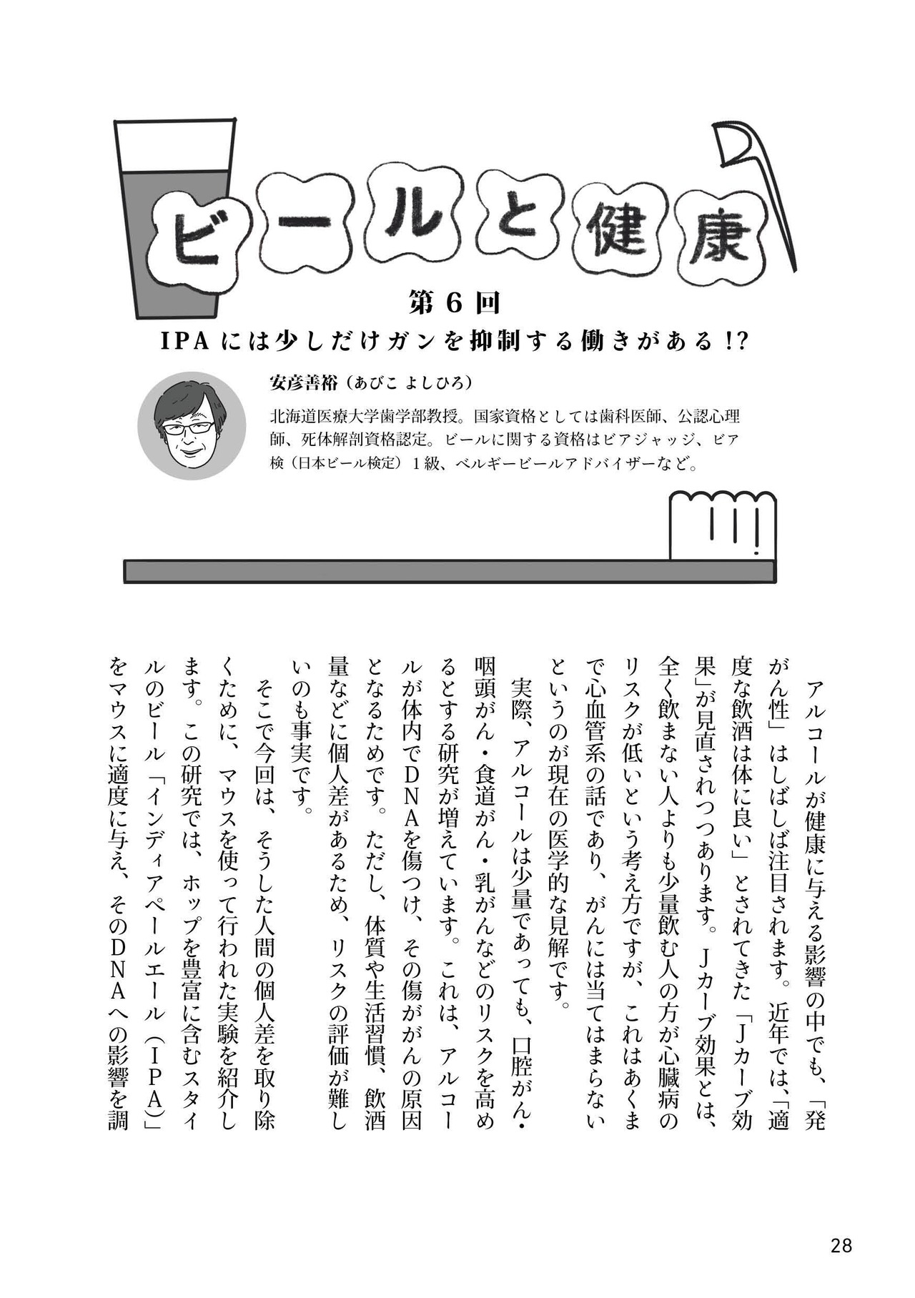 著者は北海道医療大学歯学部教授・安彦善裕先生です。歯科医師、口腔病理指導医、公認心理師、そしてビアジャッジという、健康と酒を熟知した立場から、科学的根拠のある二日酔い防止・回復の方法をまとめています。本書で「飲み方改革」を実現し、酒を末長く楽しめる豊かな人生を!